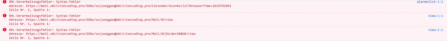 ginx-mailcow_1 | MYIPADDRESS - - [16/Nov/2021:11:18:54 +0100] "GET /SOGo/so/mail@MYSERVER.COM/Calendar/alarmslist?browserTime=1637057933 HTTP/1.1" 500 36 "https://mail.MYSERVER.COM/" "Mozilla/5.0 (X11; Linux x86_64; rv:78.0) Gecko/20100101 Firefox/78.0"