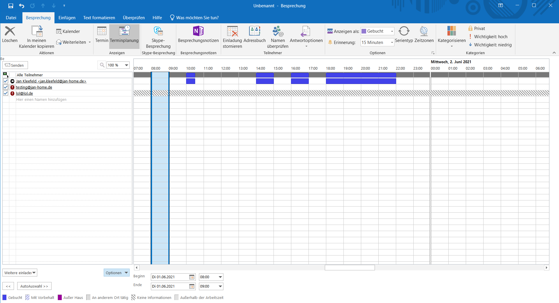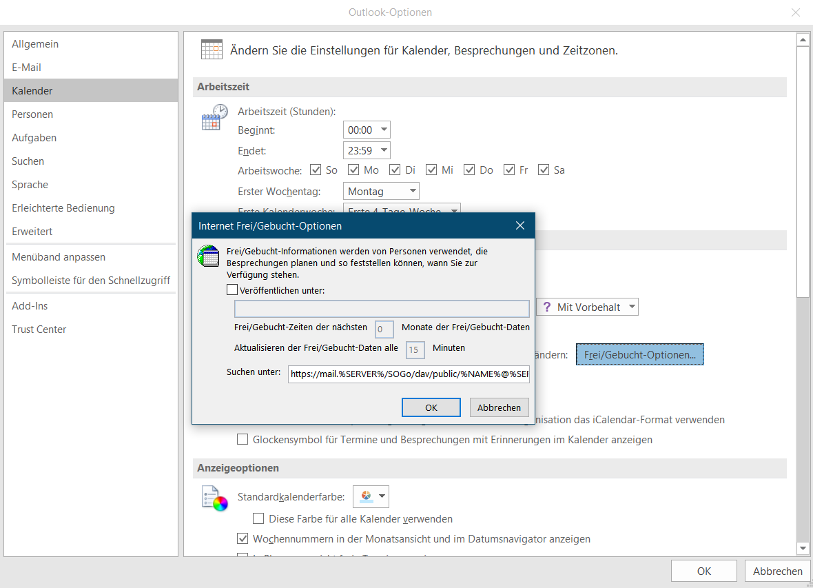 | Description | Obwohl Termine eingetragen sind, wird der Status beim Terminplanungsassistent nicht korrekt angezeigt. Der Eigene Status wird angezeigt, da der Kalender ja auch lokal vorhanden ist. Wenn ich mir den Status über die URL anzeigen lasse, bekomme ich lediglich folgenden Output: BEGIN:VCALENDAR Ich vermute hier sollte mehr aufgeführt sein. Die Einstellungen in Outlook für die Internet frei/gebucht Optionen finden Sie auch im Anhang. Siehe Screenshots für weitere Informationen. Vielen Dank im Voraus für Ihre Unterstützung | ||||
