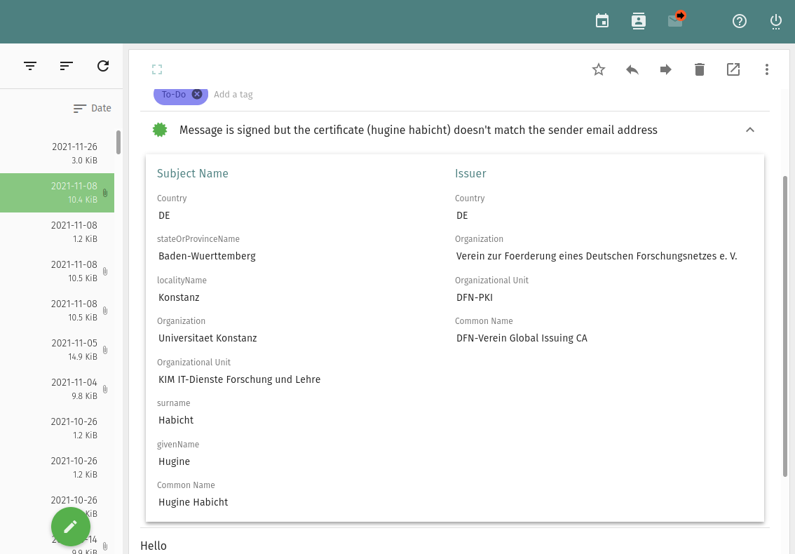 | Description | When receiving a signed email you want to check the certificate for match with the sender of the email. As those can also be stored in (multiple) emailAddress fields in the alternate section, they should be also displayed. | ||||
