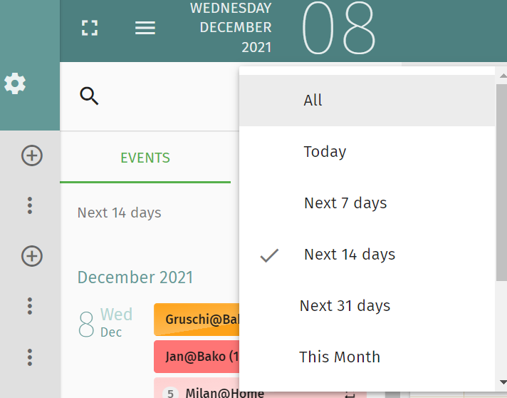 | Description | The sorting function for the events is missing the ability to show appointments in the past in a functional manner. The only way to see past appointments is to choose "this month", "this year" or "all". This is not viable, as this leads to massive loading times if calendars have been in regular use for longer than a few weeks and this would also show hundreds of appointments. I would like to request adding a function to see events in the last 30 / 60 / 90 / 180 days. Much more practical would be a function where the users can input a range of dates within which the search shall be conducted. Also, the option to search by name is not necessarily helpful, as the name of the appointment or parts thereof are not always known. | ||||