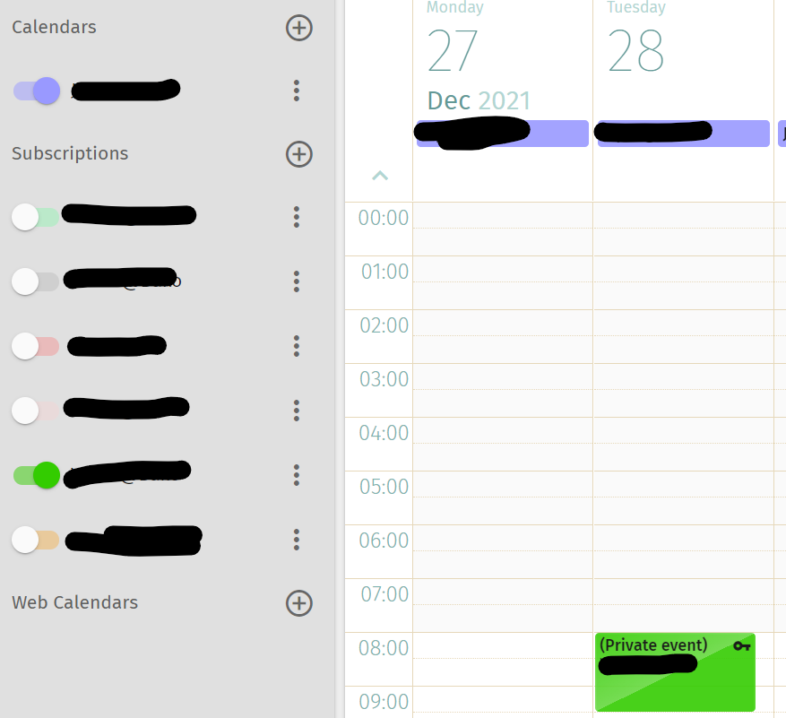 | Additional Information | Example (see screenshot): Owner of green calendar creates private event and marks the time as free. Option to hide these events is on. Purple calendar is subscribed to green calendar. Owner of purple is not shown the event. | ||||
