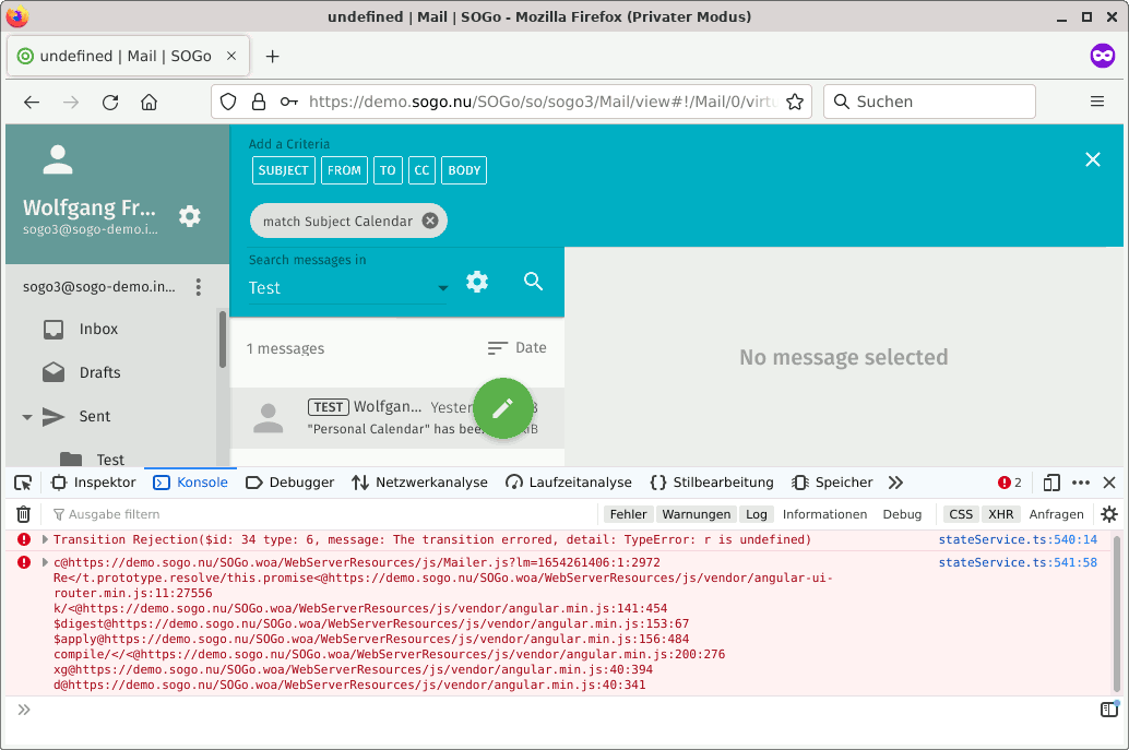 | Description | Unfortunately, when I run the advanced search in a subfolder and try to open an email from the search hits, nothing happens. The email display remains empty - but in the browser event log I see an error (see screenshot). | ||||