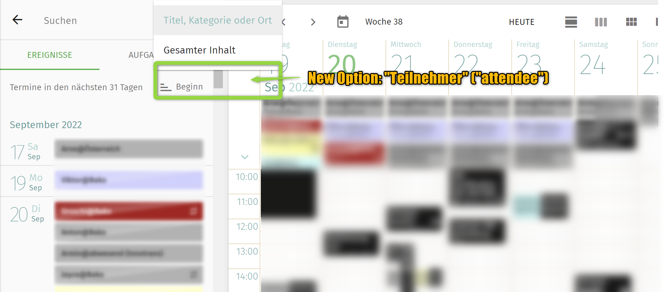 | Description | It would be helpful if one could search for calendar events by attendees, like „search for all events, where Mr. XX / xx@example.com is an participant/attendee) | ||||