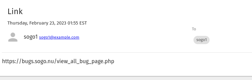 Hi Sebastien, I meant that the pasted URLs are not parsed and made into links, as most softwares do. To make it clear, in the attached screenshot is a mail sent to sogo1@example.com on the demo server. The URL inside is plain text, not a link. |