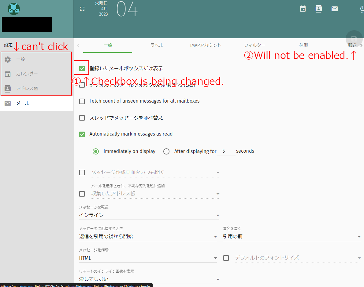 | Description | When "Preferences"->"Mail" is selected with language set to Japanese, the Preferences navigation is grayed out except for Mail, and the Save Settings button is not active when any of the settings are changed. This problem is solved by setting language to English, but it occurs 100% in Japanese. | ||||