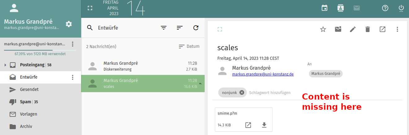 | Description | Members of University of Konstanz reported that the content of an email is not accessible anymore once it has been moved into Drafts (German "Entwürfe") folder. | ||||