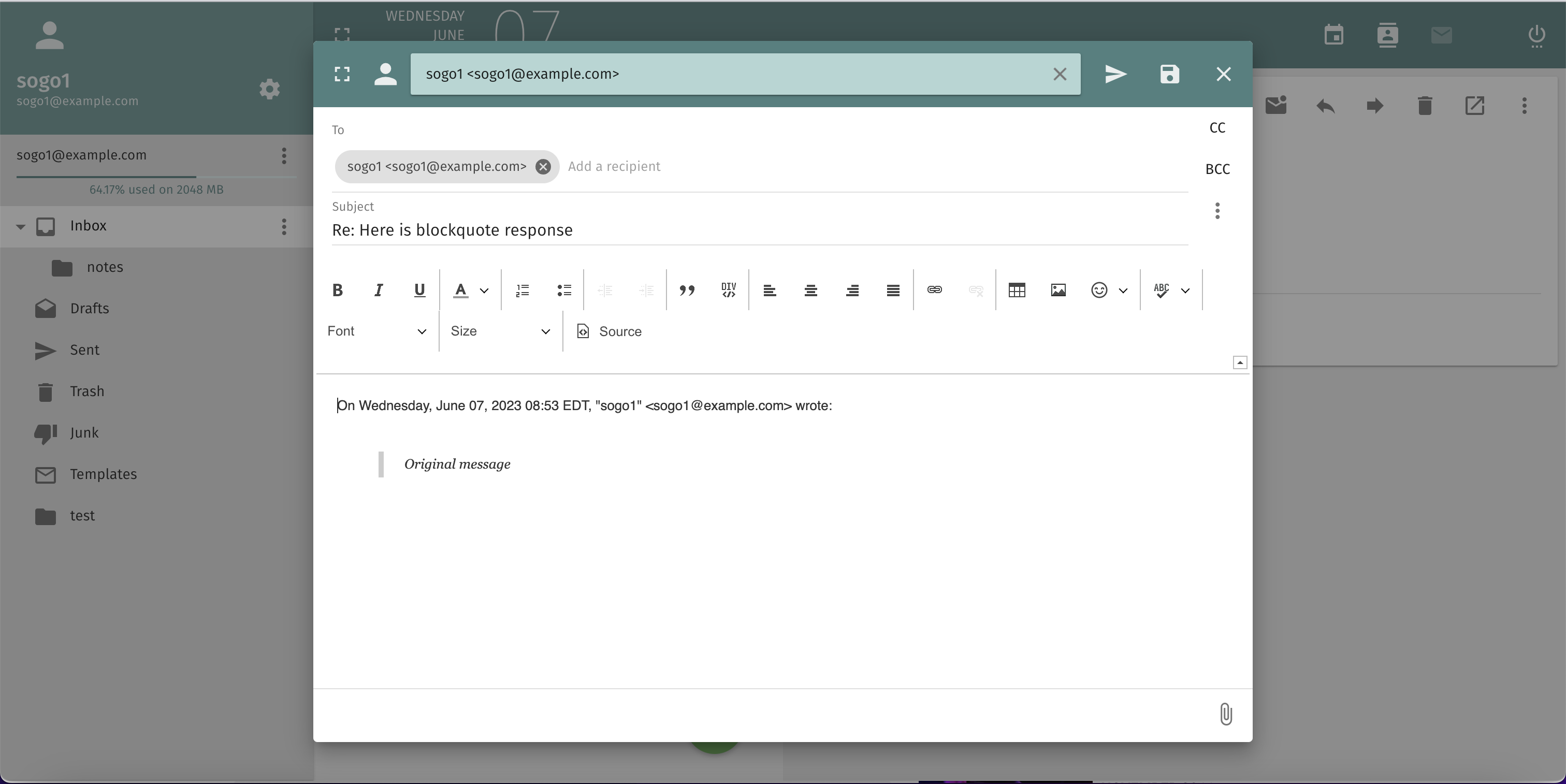 if text/plain part ist present it works fine with that. if you have mail message without that like: Content-Type: multipart/mixed; ------=_Part_7800_1630768011.1667832590613 ------=_Part_7801_1996489234.1667832590613 <html> the end blockquote tag is set before the html part (empty plain part - empty quoted reply). so the reply looks "unquoted". and yes the imap client should send a valid message with text/plain part. |