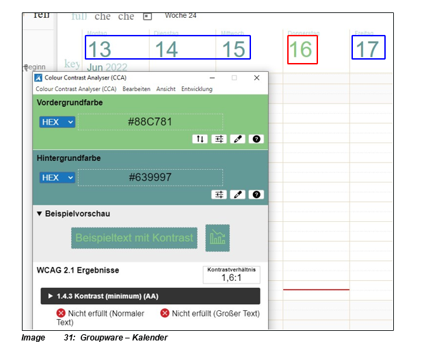 | Description | WCAG success criterion: color is not used as the only visual means to information, indicate an action, elicit a response, or distinguish a visual element. The date displayed for today (example marked red) has too little contrast with a ratio of 1.6:1 compared to the other data (example marked blue). The minimum requirement of 3:1 is therefore not met. The test step is not critically assessed because a red line marks the current time and this is considered sufficient by the contrast ratio. | ||||