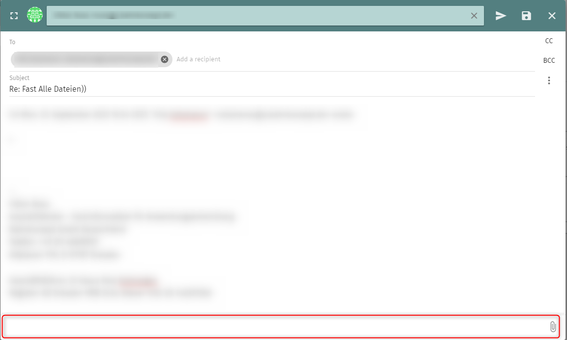 Hello, the version is 5.8.4 as written, no nightly build. The files are mainly the attached images from footer of an email (see 0005490 for our long lasting ticket) which annoying from HTML mails. Before one of the last emails they where attached in any reply and we could remove them manually not to sent them back or forward. Since last installed version they where attached as before but without any chance to delete them. Steps to reproduce: |