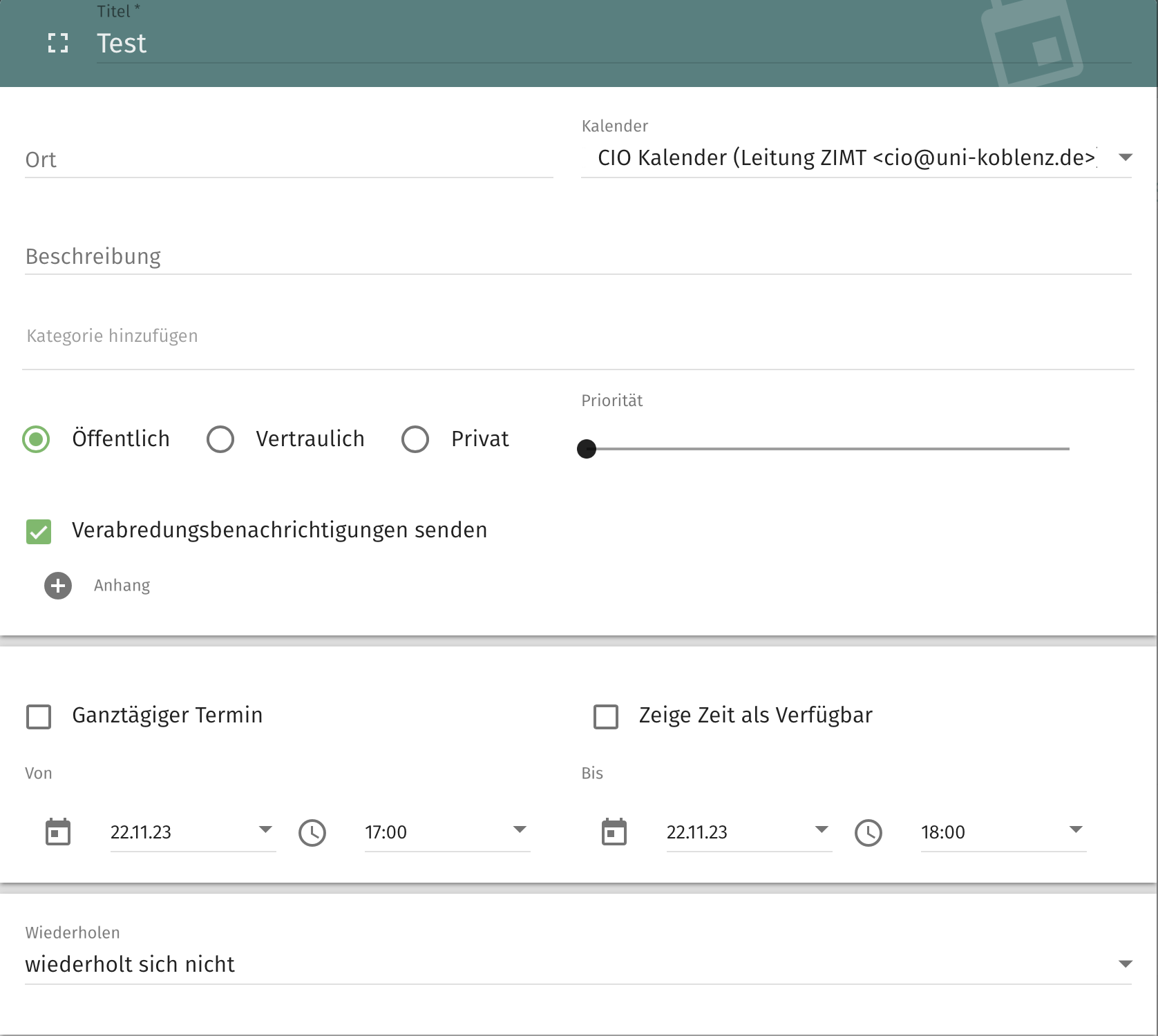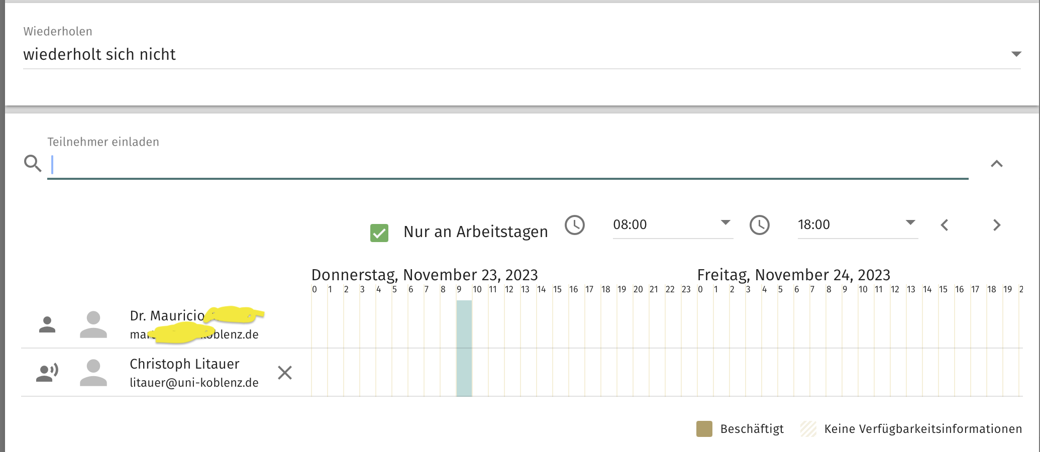 Sorry, I accidentally uploaded the same screenshot twice. Please ignore the 2nd one, here is the relevant that shows the effect: While the calandar belongs to cio@uni-koblenz.de the availability dialog displays "Mauricio" as calandar owner. |
