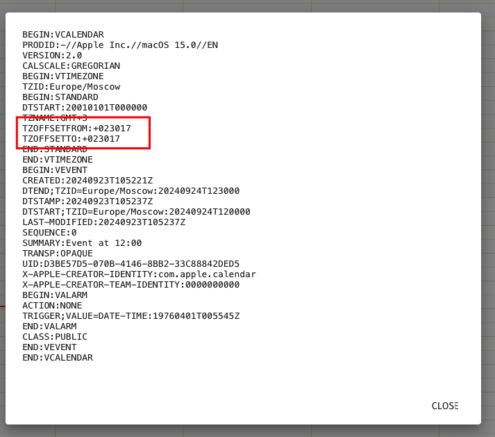 | Description | When you create new event in Sogo calendar from MacOS Calendar app, the time may differ in mac client and Sogo web client. (1.png, 2.png) If you export this event and delete 2 fields from .ics file "TZOFFSETFROM", "TZOFFSETTO" and then import this event, there is no offset in the time | ||||