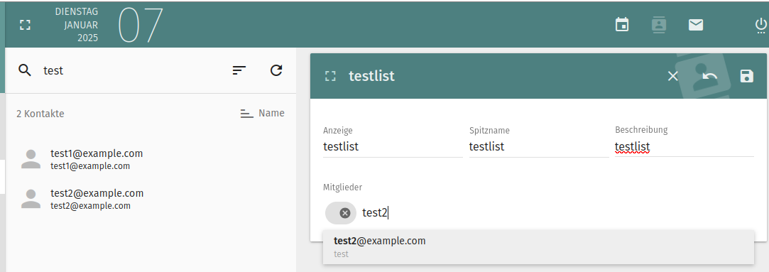 | Description | During creating or editing a list in the address book, added mail addresses dont show up, instead the greyish box is empty till containing the x. In the example below, I've added test1@example.com from the address book, which turned into the empty grey box. Selection from the addressbook still works, as shown for the test2 popup. On pressing enter there, it will also turn into an empty grey box. The not edit view of the list still works and shows the correct addresses, also using the list for mail delivery works as expected. Therefore my guess is, that just the edit list view has a view glitch here. Its still disruptive, as users no longer can use the edit view to remove a certain address from the list. | ||||