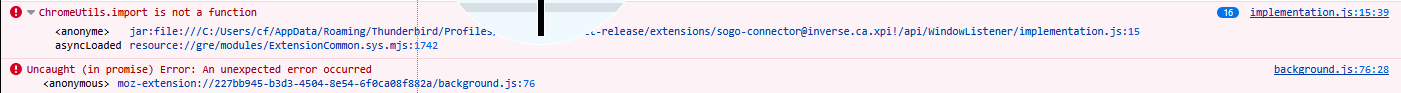 | Description | Hi, The current SOGo connector (version 128, https://github.com/Alinto/sogo-connector/tree/tb128) doesn't work with Thunderbird 140 ESR. The icons (new, subscribe, remove) are not displayed in the calendar and newly subscribed calendars using the SOGo Web interface don't appear. However, newly added events on previously subscribed calendars or newly added contacts on previous adressbooks still do sync. On startup, two errors are displayed in the Thunderbird console (see attached screnshot too): ChromeUtils.import is not a function 16 implementation.js:15:39 Thank you, Fabio | ||||