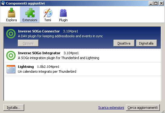 This is my sogo.log when i install addons and TB3 restart localhost - - [15/Nov/2010:12:45:46 GMT] "OPTIONS /SOGo/dav/alessio/Contacts HTTP/1.1" 401 0/0 0.004 - - 0 This is when I open TB localhost - - [15/Nov/2010:12:46:13 GMT] "OPTIONS /SOGo/dav/alessio/Contacts HTTP/1.1" 401 0/0 0.005 - - 0 All about contacts, nothing about calendar |